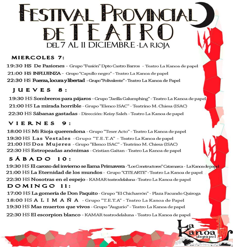 Desde el miércoles 7 y hasta el domingo 11 de diciembre tendrá lugar el Festival Provincial de Teatro en la sala La Kanoa de Papel y el teatrino Manuel Chiesa del ISAC. Se trata de una instancia organizada por grupos independientes y sin fines de lucro que ofrece un programa con 17 propuestas teatrales de La Rioja y de Catamarca. Las entradas tendrán un valor de 30 pesos y están disponibles abonos promocionales..