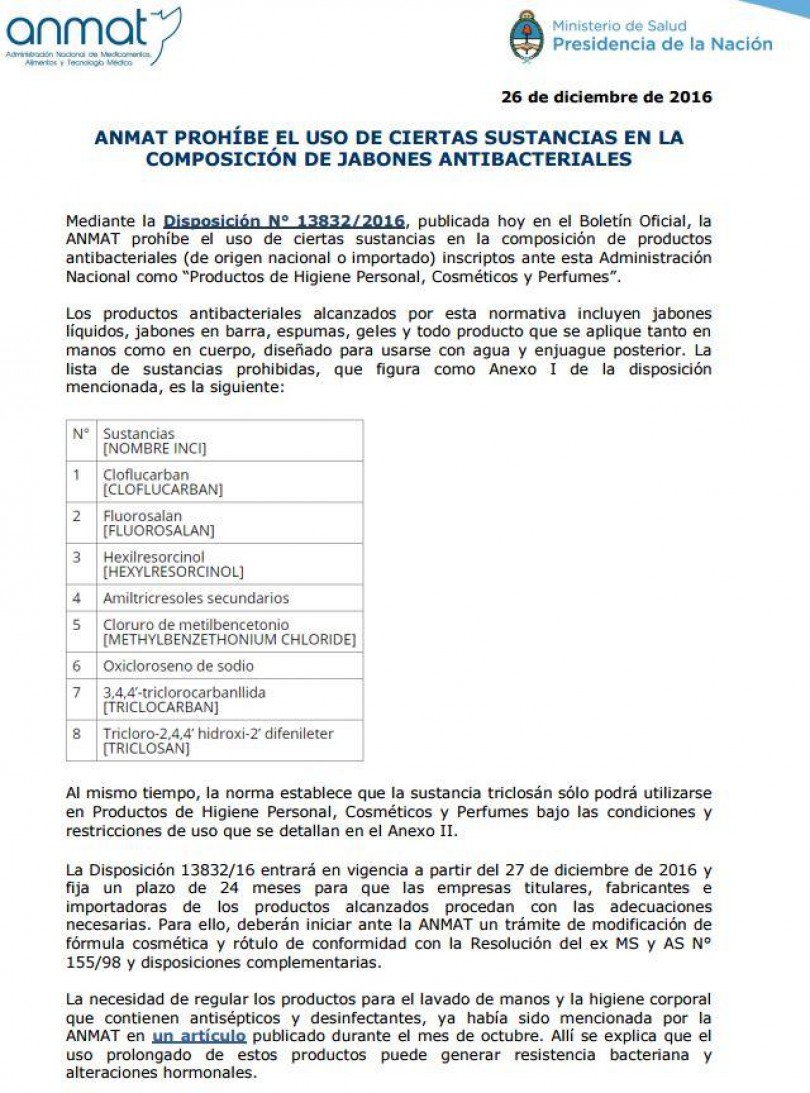 La Anmat recuerda que "es pertinente citar que la Organización Mundial de la Salud sostiene que el lavado de manos con jabón tradicional y agua corriente sigue siendo una de las medidas más importantes que se pueden tomar para evitar contraer enfermedades y prevenir la propagación de microbios a otras personas".