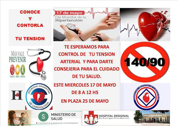 Con motivo de celebrarse este miércoles 17 de Mayo el Día Mundial de la Hipertensión, trabajadores de salud del Hospital Enrique Vera Barros y de la Clínica Incor efectuarán controles de tensión arterial y harán recomendaciones sobre hábitos saludables de 8 a 12 en la Plaza 25 de Mayo..