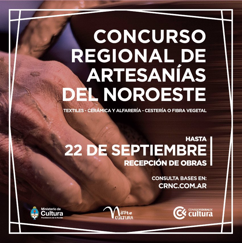 El Consejo Regional Norte Cultura lanza el 1º Concurso de Artesanías del Noroeste, destinado a artesanos mayores de 18 años nacidos o residentes en las provincias de Catamarca, Jujuy, La Rioja, Salta, Santiago del Estero y Tucumán..