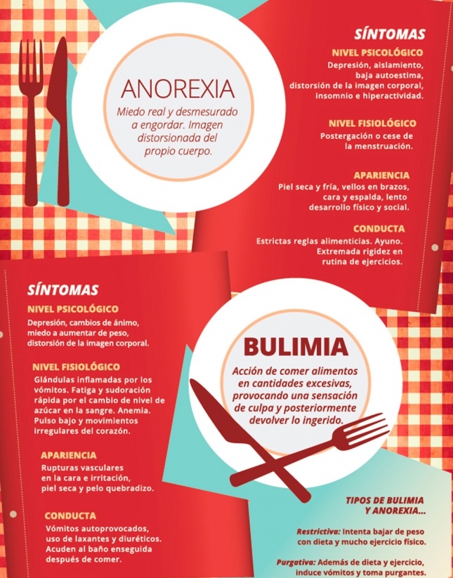 En la bulimia, se experimentan ataques de voracidad que vendrán seguidos por ayunos o vómitos para contrarrestar la ingesta excesiva, abuso de laxantes para facilitar la evacuación, preocupación excesiva por la imagen corporal, depresión, ansiedad y culpabilidad.