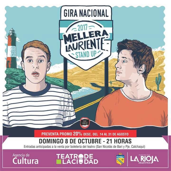 La Municipalidad de La Rioja comunica que las entradas para el espectáculo de Stand Up "Mellera-Lauriente: Gira Nacional 2017", a realizarse el domingo 8 de octubre, se pueden adquirir con un 20% de descuento en las boleterías del Teatro de la Ciudad (San Nicolás de Bari y Pasaje Calchaquí) hasta el jueves 31 de agosto, de 9 a 12 y de 18 a 21 horas..