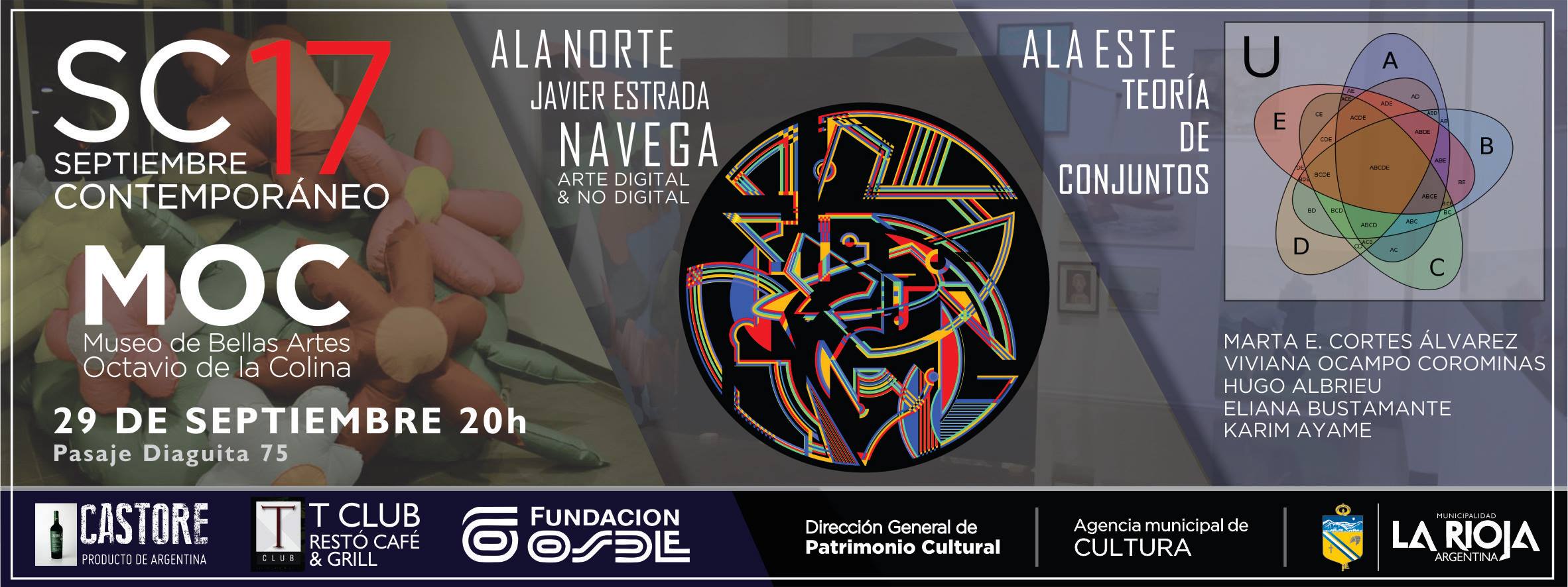El MOC inauguró su tercera edición del ciclo Septiembre Contemporáneo con dos muestras de arte contemporáneo de artistas riojanos. En sus salas del Ala Norte Javier Estrada exhibirá la muestra Navega; y en las del Ala Este se podrá ver la muestra colectiva Teoría de Conjuntos de Marta Elena Cortes Álvarez, Viviana Ocampo Corominas, Hugo Albrieu, Eliana Bustamante y Karim Ayame..