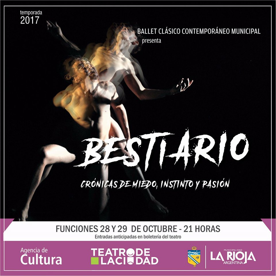 La Municipalidad de La Rioja a través de la Agencia de Cultura invitan a la obra “Bestiario” a cargo del Ballet Municipal Clásico Contemporáneo, cuya trama representará la crónica de miedo, instinto y pasión de un hombre.