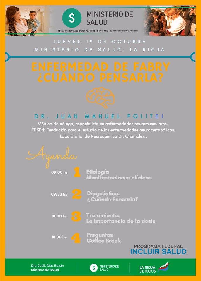 El Ministerio de Salud a través del Programa Federal de INCLUIR SALUD, brindará este jueves 19, una capacitación sobre la enfermedad de Fabry. La misma se desarrollara en la sala de Situación del Ministerio de Salud desde las 9..