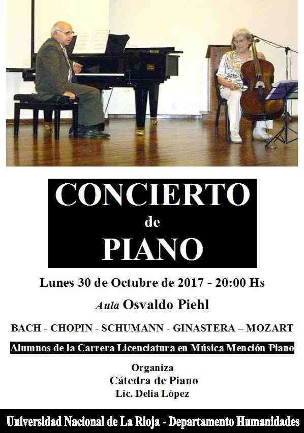 La Cátedra de Piano a cargo de la licenciada Delia López invita a la comunidad en general al Concierto de Alumnos que se desarrollará el día lunes 30 de Octubre a las 20 horas en la Sala de Conciertos "Osvaldo Piehl". La misma está ubicada en el Quinto Módulo del predio de la UNLaR..