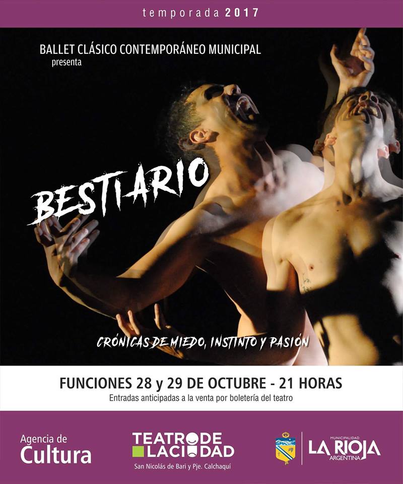 La Agencia de Cultura Municipal comunica que este sábado 28 y domingo 29 de octubre, desde las 21, se presentará la obra "Bestiario" en el Teatro de la Ciudad, cuya producción y puesta en escena estará a cargo del Ballet Clásico Contemporáneo Municipal..
