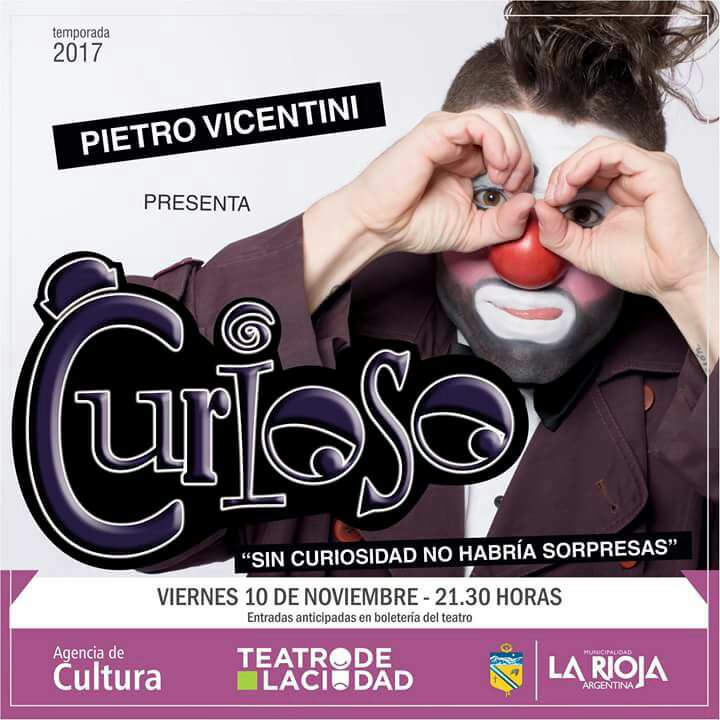 El 10 de noviembre en el Teatro de la Ciudad se presenta Pietro Vicentini con el show Curioso. Clown de los exitosos espectáculos de Flavio Mendoza, Stravaganza y Mahatma el artista hará una función a las 21:30 horas..