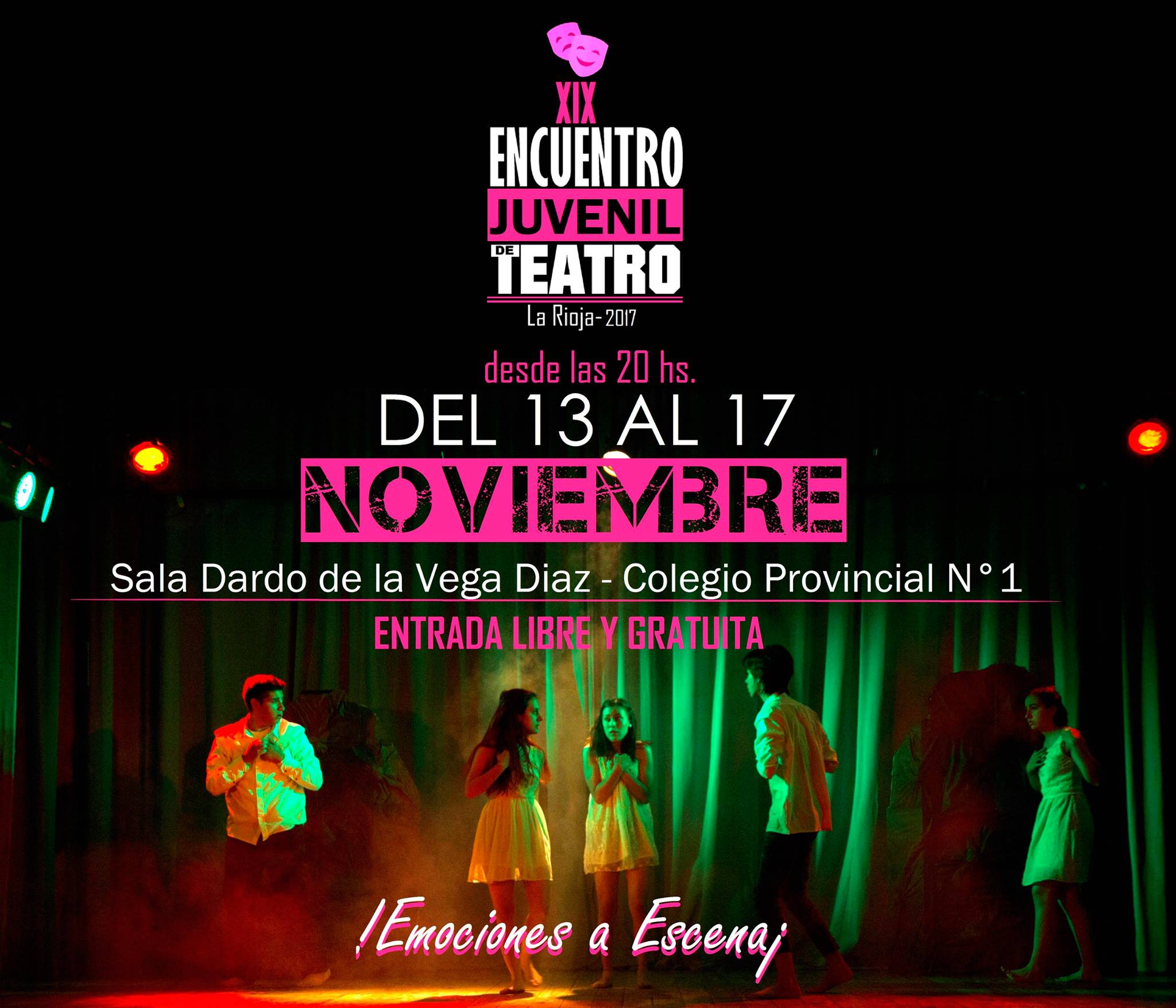 Desde el lunes 13 a las 20 horas, hasta el viernes 17 de noviembre tendrá lugar una nueva edición del Encuentro Juvenil de Teatro. Como desde hace 19 años ininterrumpidamente se sostiene este espacio de expresión y talento de los jóvenes de esta provincia. La entrada es libre y gratuita..