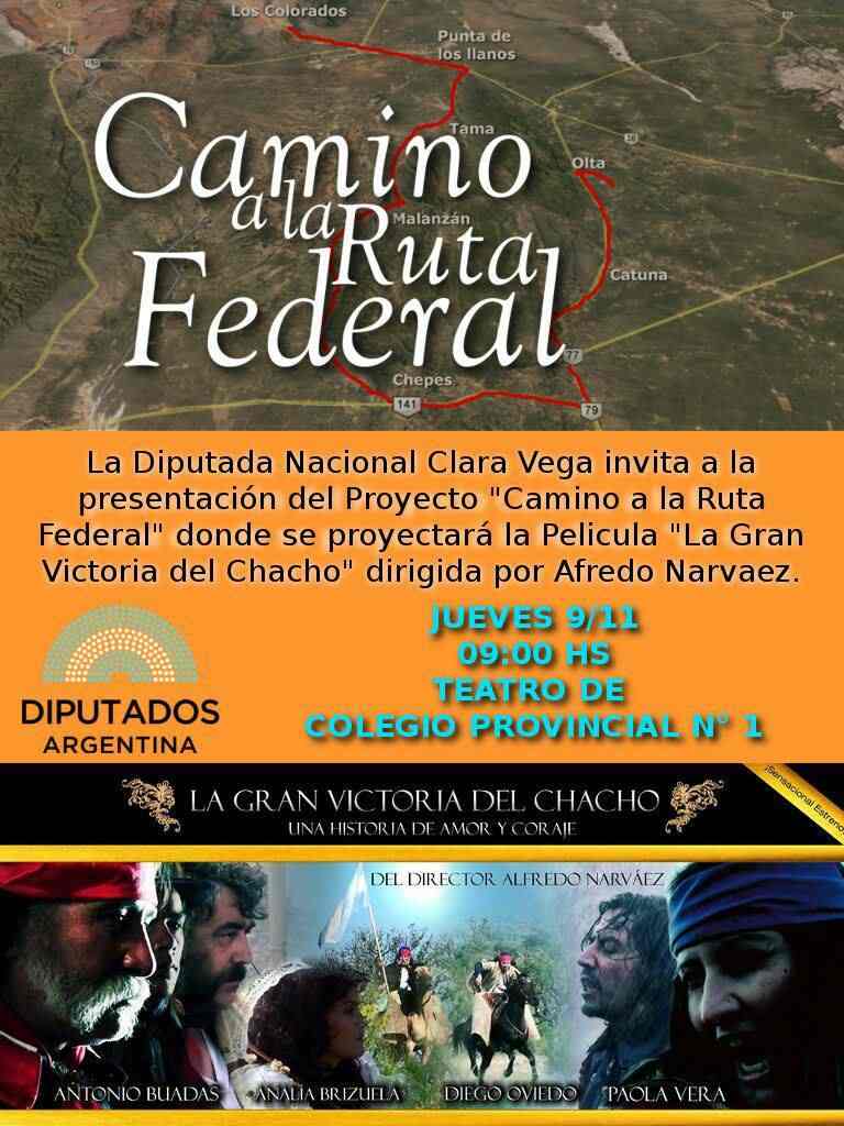 Este jueves desde las 9 será proyectada la película La Gran Victoria del Chacho en el marco de la presentación del proyecto de la diputada Clara Vega denominado Camino a la Ruta Federal en el Colegio Provincial 1. El guionista y director Fredy Narváez dijo nunca ningún legislador o funcionario se había acercado a la película, en diálogo con El Independiente Digital..