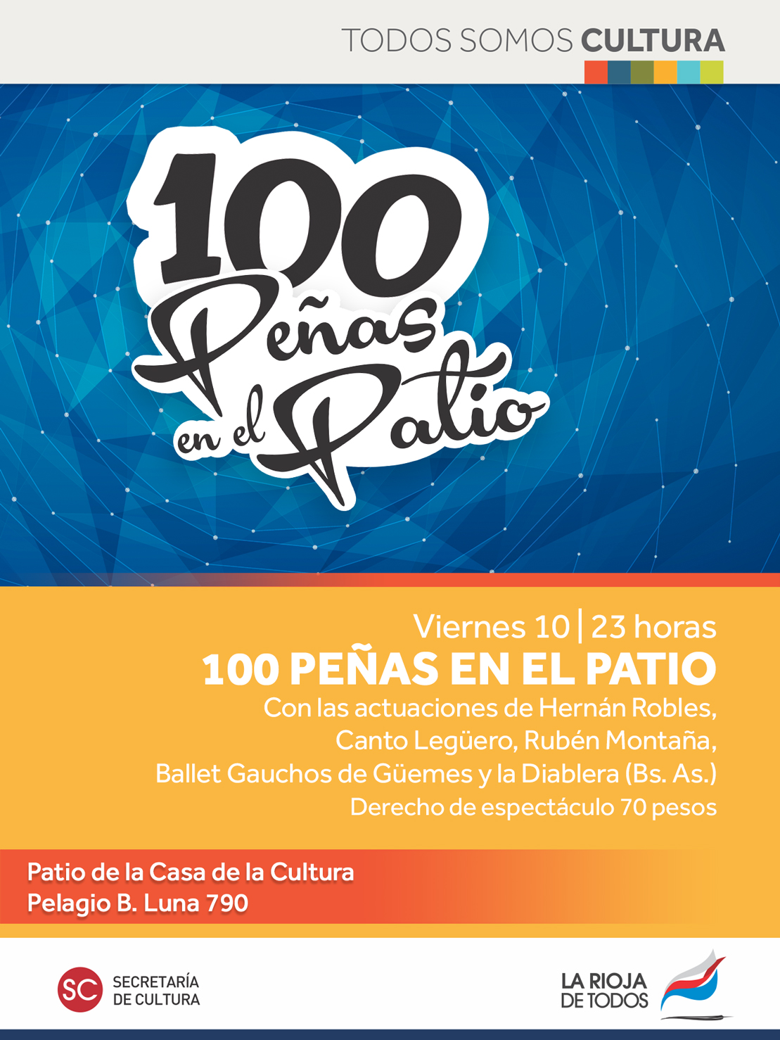 La Peña de este viernes contará con las actuaciones de Hernán Robles, Canto Legüero, Rubén Montaña, Ballet Gauchos de Güemes y la Diablera (Bs. As.), con el cobro de un derecho de espectáculo de 70 pesos.