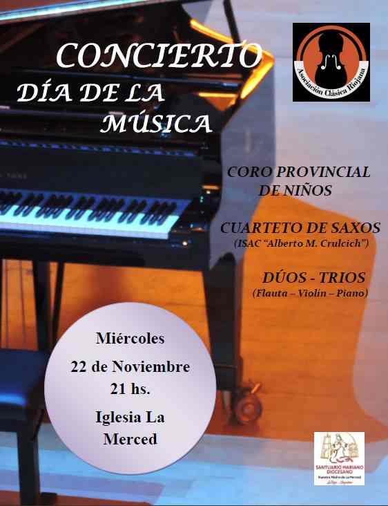 Organizado por la Asociación Clásica Riojana en la ocasión actuarán el Coro Provincial de Niños, el Cuarteto de Saxos del ISAC Alberto Mario Crulcich y Dúos y Tríos de Flauta, Violín y Piano.
