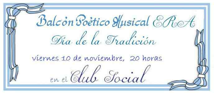 Organizado por Escritores Riojanos Asociados (ERA), hoy se realizará el Balcón Poético Musical Día de la Tradición, a las 20, en Club Social de esta Capital. Con entrada libre y gratuita, habrá panel poético, danzas, tango, folclore y la presentación de la cantante lírica Gabriela Maldonado..