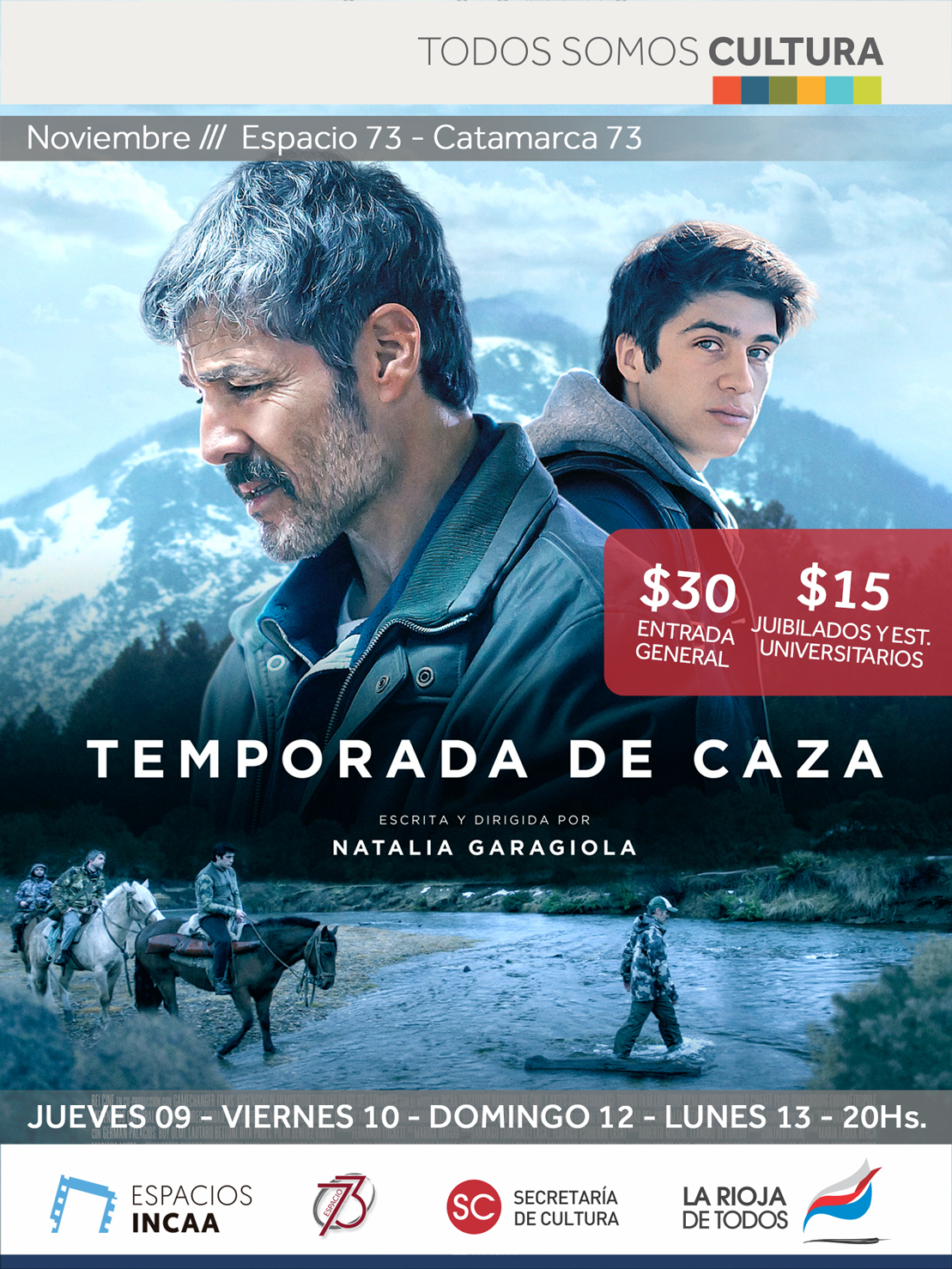 “Temporada de Caza” es el filme que se proyectará a las 20 horas. El largometraje de Natalia Garagiola fue premiado en el Festival de Cine de Venecia. Es una coproducción entre nuestro país, los Estados Unidos, Francia, Alemania y hasta con capitales de Qatar, cuenta la historia de Nahuel, un adolescente (Lautaro Bettoni) con una conducta violenta, que ante la muerte de su madre se reencuentra con su padre (Germán Palacios), a quien no ve desde hace una década. Él es un guía muy respetado en la Patagonia y este reencuentro, ene l corazón del invierno los enfrentará con su propia capacidad de perdonar o matar.