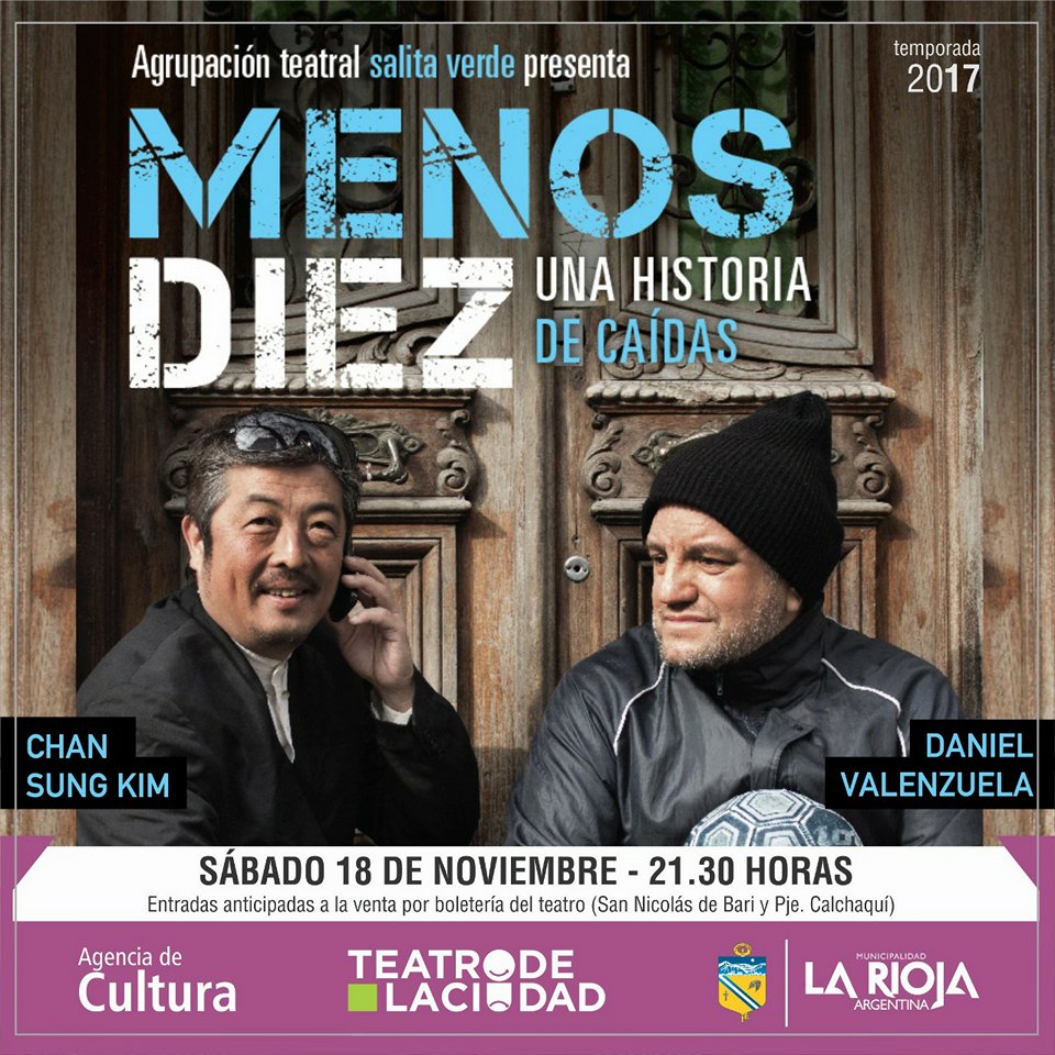 La Agrupación Teatral Salita Verde presenta "Menos Diez (Una Historia de Caídas)" con Chan Sung Kim y Daniel Valenzuela. La función será el sábado 18 de noviembre desde las 21:30 horas en el Teatro de la Ciudad..