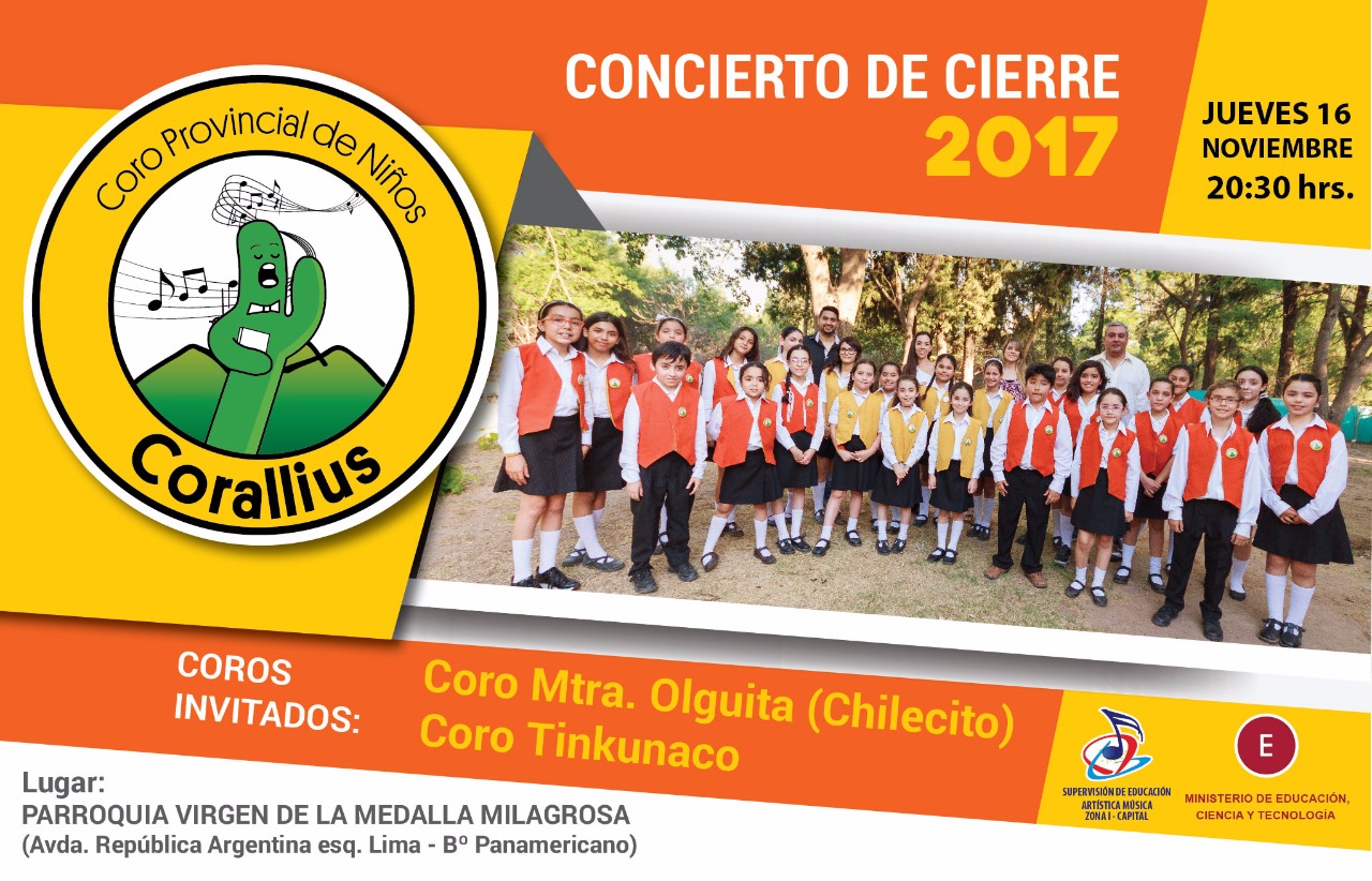El jueves 16 de noviembre a las 20:30 horas tendrá lugar el Concierto de Cierre 2017 del Coro Provincial de Niños Corallius. La cita es en la Parroquia Virgen de la Medalla Milagrosa del barrio Panamericano..