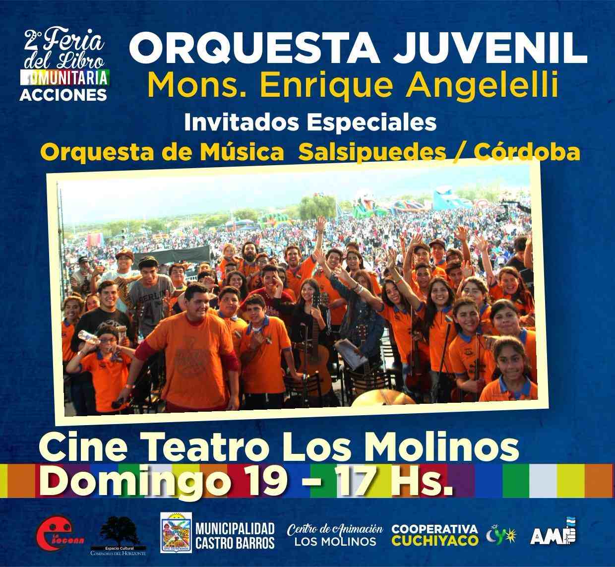 La Orquesta Comunitaria Enrique Angelelli actuará en Los Molinos. Será el domingo 19 de noviembre a las 17 horas en el Cine Teatro. La acompañará la Orquesta Juvenil del MusiCAJ de Salsipuedes, Córdoba. La entrada es gratuita..
