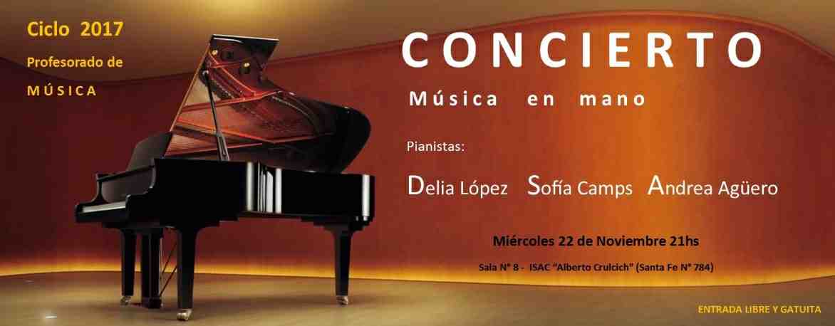 Enmarcado en el Día de la Música tendrá lugar un imperdible concierto denominado "Música en mano", a cargo de las pianistas Delia López, Sofía Camps y Andrea Agüero quienes interpretarán un variado repertorio para este instrumento..