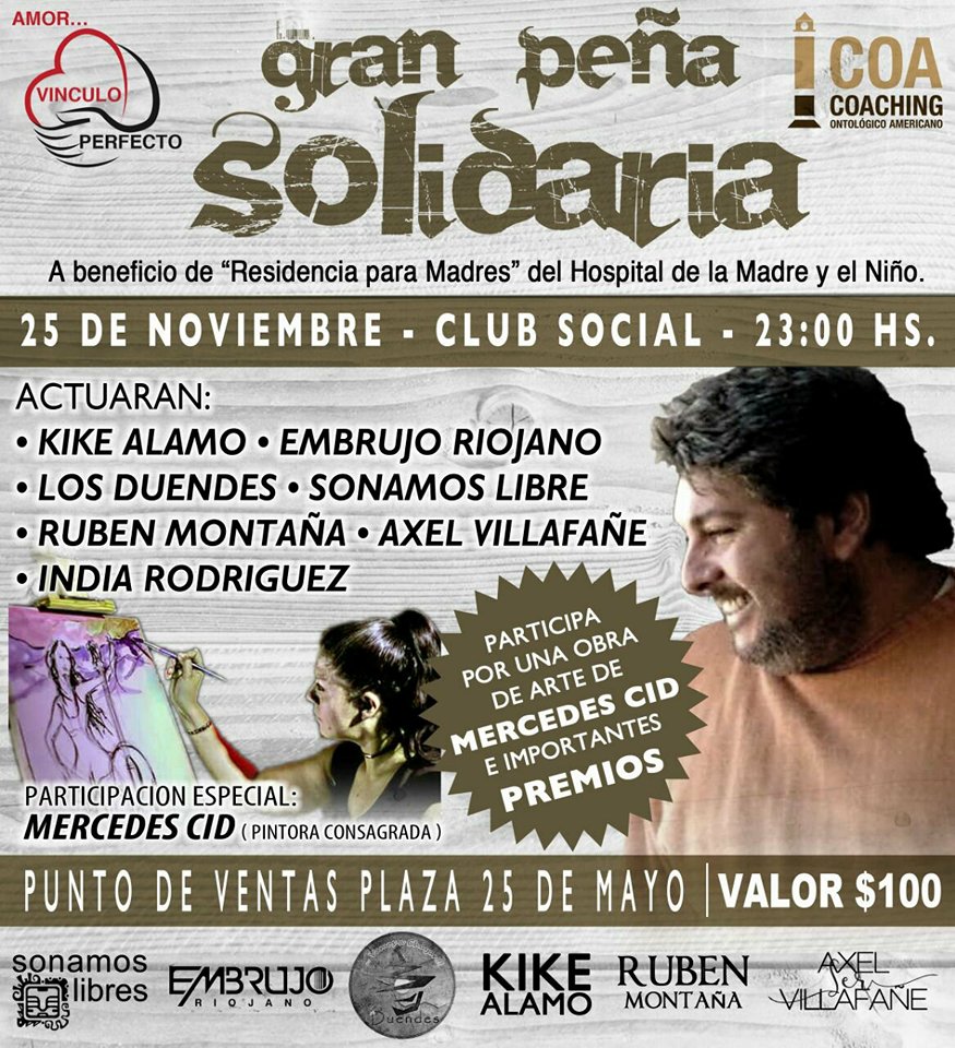 A beneficio de la Residencia para Madres del Hospital de la Madre y el Niño, el sábado 25 de noviembre tendrá lugar desde las 23 horas una Gran Peña Solidaria con la actuación de destacados músicos locales. La artista Mercedes Cid sorteará una de sus obras..