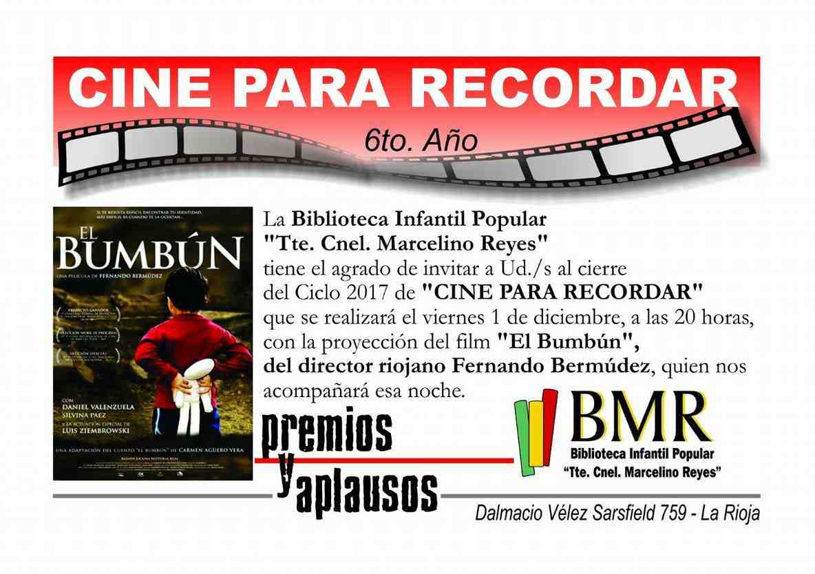 El viernes 1 de diciembre la Biblioteca Popular Marcelino Reyes (Dalmacio Vélez Sársfield 759) cierra la 6ta. temporada de su ciclo Cine para Recordar-Premios y Aplausos con la exhibición del film El Bumbún y la presencia de su director Fernando Bermúdez..