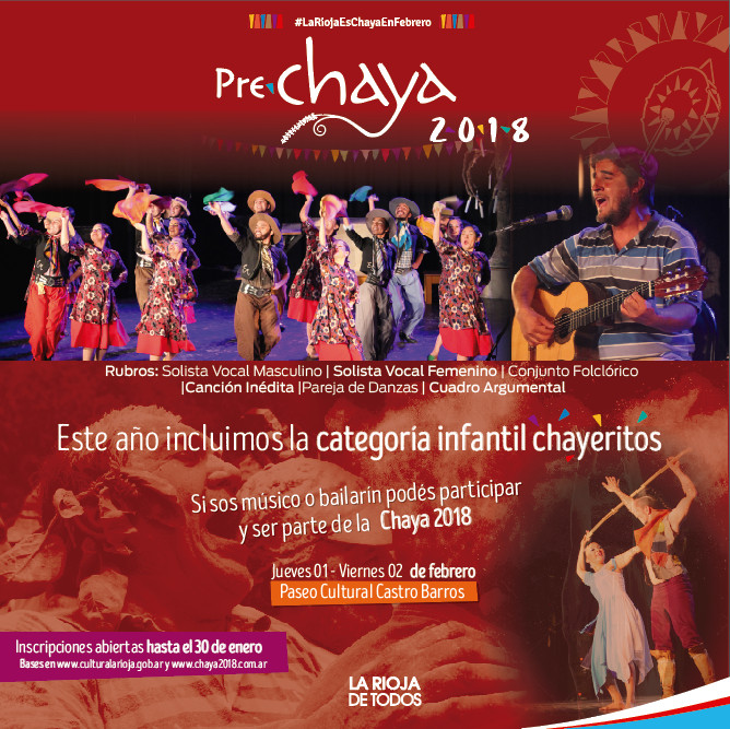 El Gobierno de la Provincia convoca a bailarines y músicos del país, mayores de 18 años, a participar en la Pre Chaya 2018. Los ganadores recibirán como premio la actuación en el Festival. Este año se incluye también el certamen Chayerito. Las inscripciones se receptarán hasta el 30 de enero..