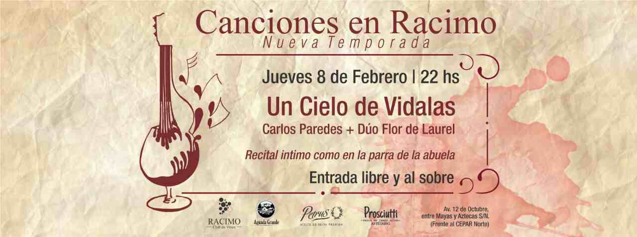 Este jueves 8 de febrero desde las 22 horas en Racimo Club de Vinos (AV. 12 de Octubre frente al Cepar Norte) Carlos Paredes y el Dúo Flor de Laurel presentan un recital íntimo en el marco del lanzamiento del disco Un cielo de Vidalas..