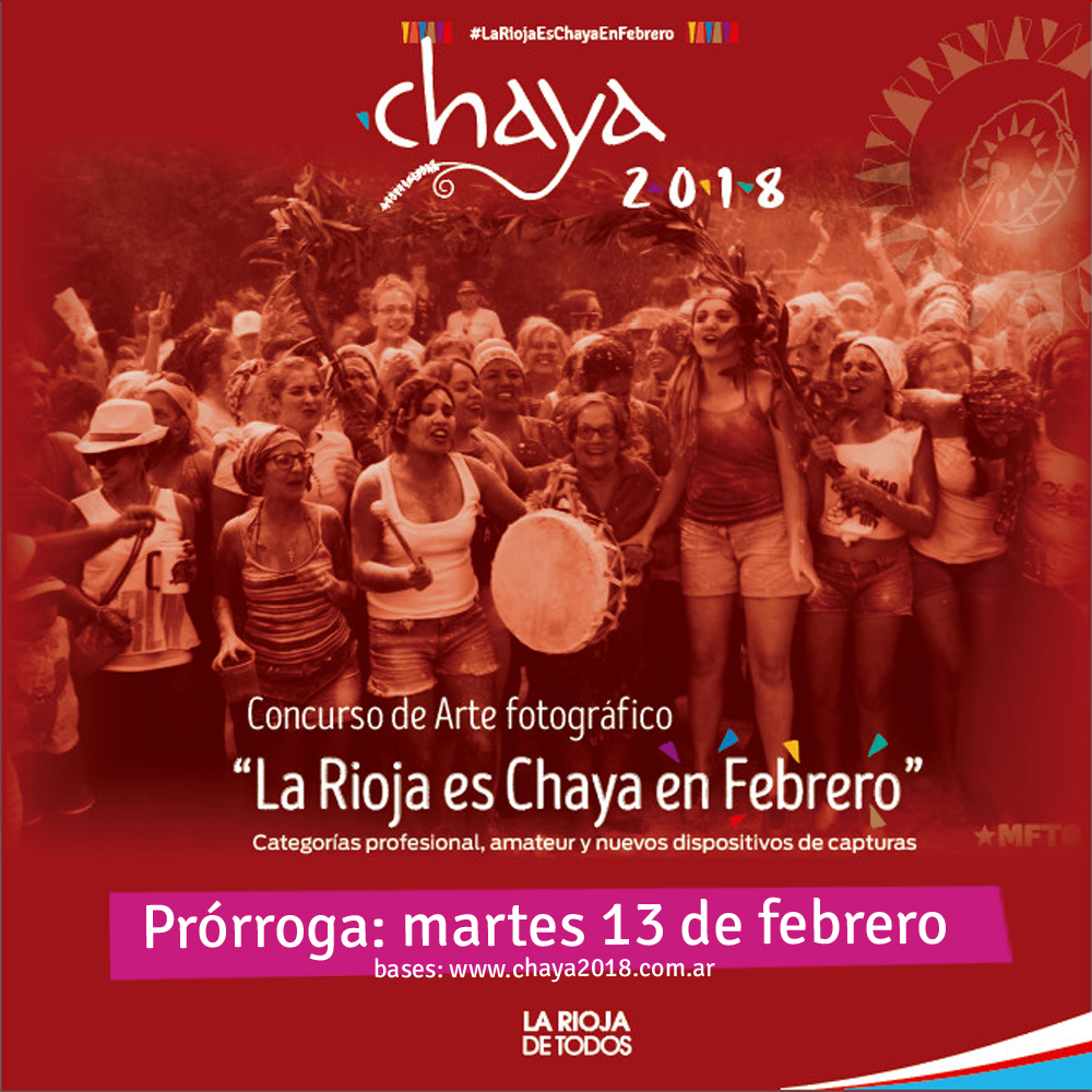 La Secretaría de Cultura informa que se extendió el plazo para presentar las fotografías en el concurso La Rioja es Chaya en febrero hasta el martes 13 de febrero. La decisión se tomó obedeciendo al pedido especial de participantes..