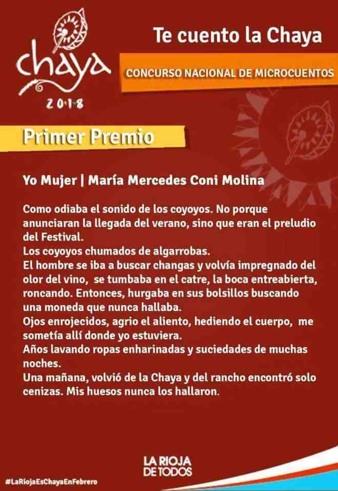 Yo mujer es el texto que obtuvo el Primer Premio del Concurso de Microcuentos "Te cuento la Chaya". Su autora es Maria Mercedes Cony Molina se refirió a su narración y dio a conocer su posición respecto a las críticas y polémicas surgidas en las redes sociales al respecto..