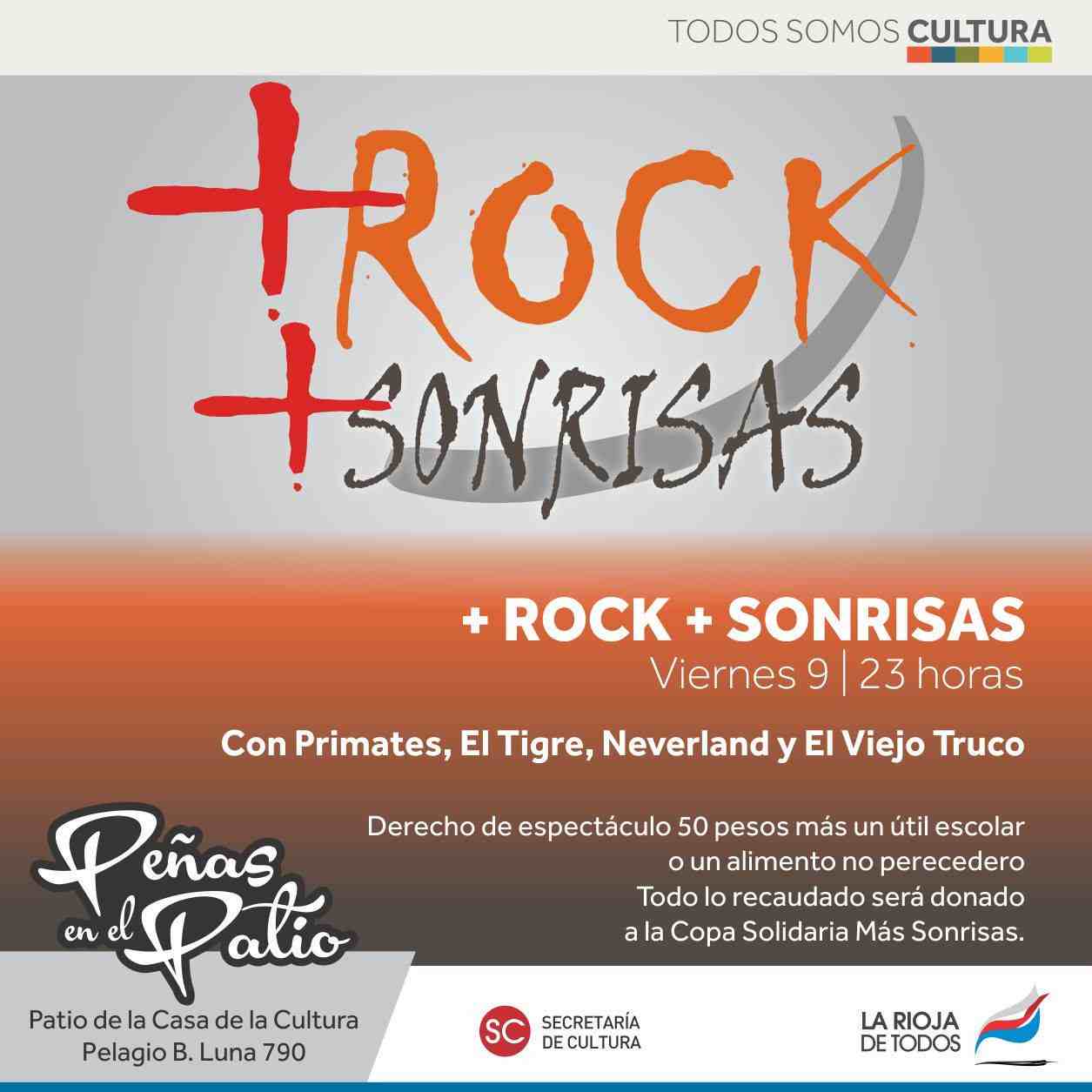 “+Rock +Sonrisas” será un ciclo que se desarrollará durante todo el año en el Patio. Con el objetivo de unir a las bandas locales de las diversas ramas del rock con fines solidarios, este viernes 9 de marzo abre el ciclo con Primates, Neverland, El Viejo Truco y El Tigre, grandes formaciones con años de trayectoria dentro y fuera de la provincia.