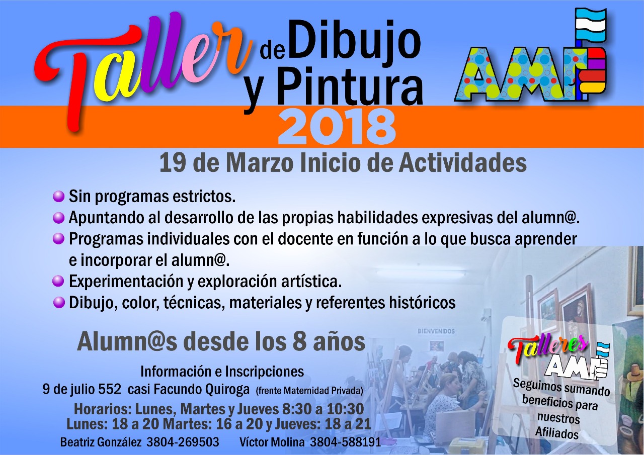 La Asociación de Maestros y Profesores de La Rioja (AMP), informa que el próximo 19 de marzo, iniciará sus actividades, el Taller de Dibujo y Pintura de AMP, destinado a alumnas y alumnos desde los 8 años de edad. El mismo es para hijos/as y nieto/as de afiliados del sindicato..