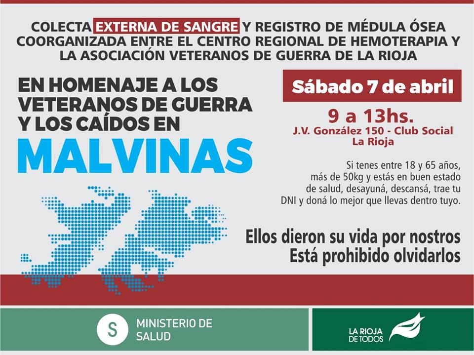 En homenaje a los veteranos de guerra y los caídos en Malvinas el sábado 7 de abril desde las 9 de la mañana y hasta las 13 horas, se realizará una colecta externa de sangre y registro de médula ósea, en Club Social ubicado en Joaquín Víctor González N° 150..