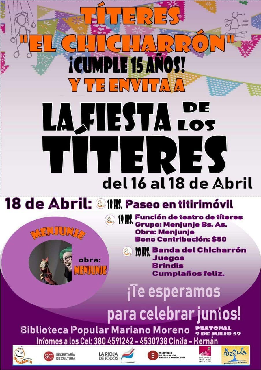 El grupo de títeres El Chicharrón cumple 15 años y preparó un gran festejo con funciones para alumnos, grupos invitados y talleres para niños y adultos. Las actividades se realizarán entre el 16 y el 18 de abril y cuentan con el auspicio de la Secretaría de Cultura y el Ministerio de Educación..