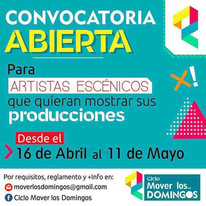 “Estos elencos que queden seleccionados tendrán ganancias económicas. Hay una serie de requisitos que están explicados en el Facebook/Ciclo Mover los Domingos junto a las bases y condiciones. La participación es totalmente gratuita. Es importante que escriban la necesidad y requerimiento técnico porque es responsabilidad nuestra y de la productora brindarles lo que necesiten”.