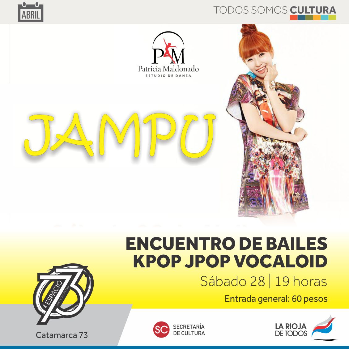 La Secretaría de Cultura informa que este sábado a las 19 horas se presentará en la sala del Espacio 73, el Encuentro de bailes Kpop, Vocaloid y jpop. Es un evento en el que los grupos de La Rioja muestran sus destrezas en estos estilos..