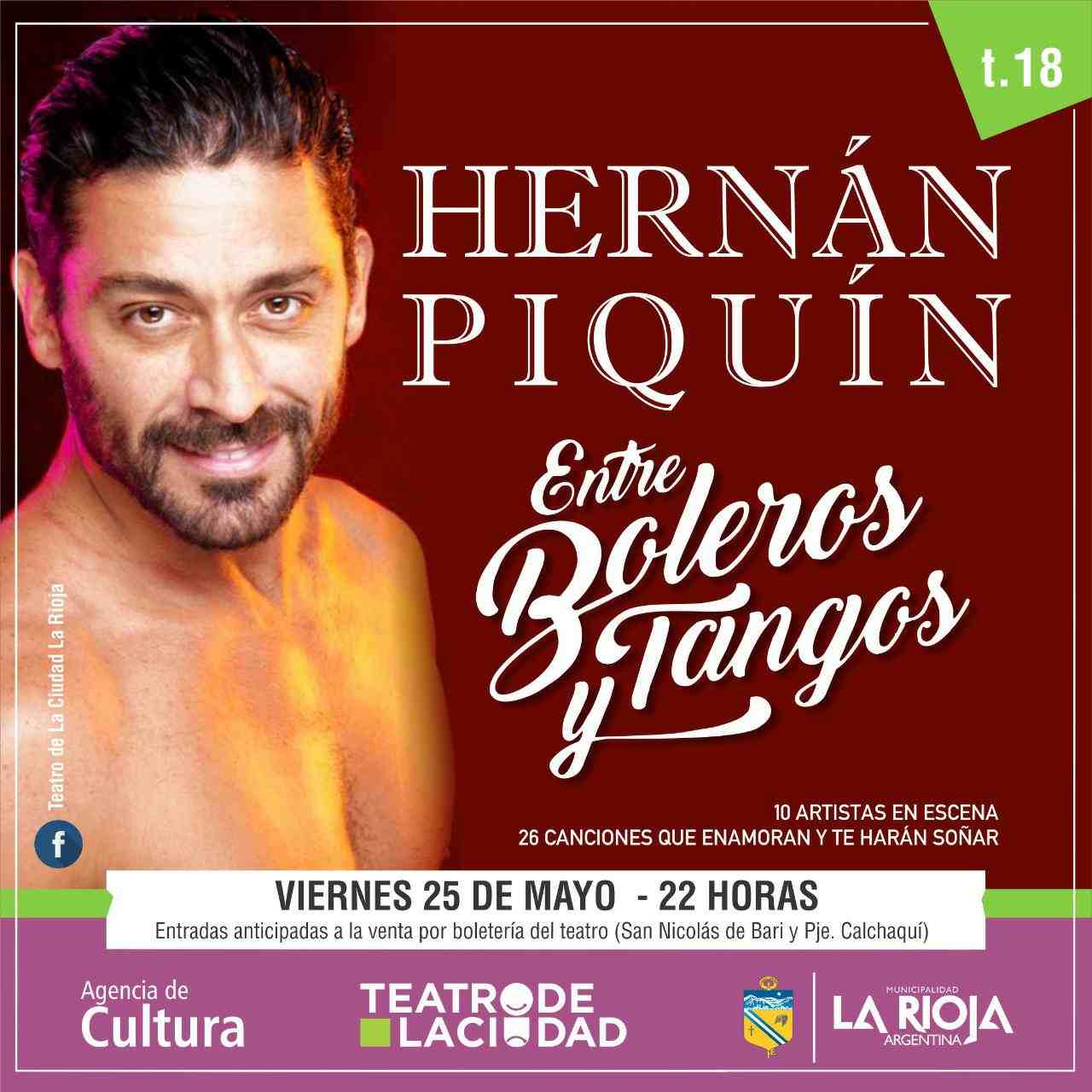 Hernán Piquín, el prestigioso bailarín presenta una vez mas, todo su arte en un espectáculo que promete deslumbrar con artistas de jerarquía que recorrieron el mundo con su danza, música imágenes, vestuario, luces y sonido, harán de este show un momento único con Hernán Piquín entre boleros y Tangos. Será el 25 de mayo a las 22 horas en el Teatro de la Ciudad..