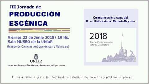 Las Jornadas de Producción Escénica son una actividad de Extensión de la cátedra Técnicas de Gestión y Producción de Espectáculos de la Licenciatura en Arte Escénico de la UNlaR, siendo la docente a cargo la licenciada Silvana Romero. Tienen como objetivo crear un espacio de diálogo entre estudiantes, docentes, artistas y público interesado en reflexionar sobre problemáticas relacionadas a la producción escénica, vincular a los estudiantes con el medio y a la comunidad artística en general para pensar sobre su hacer.