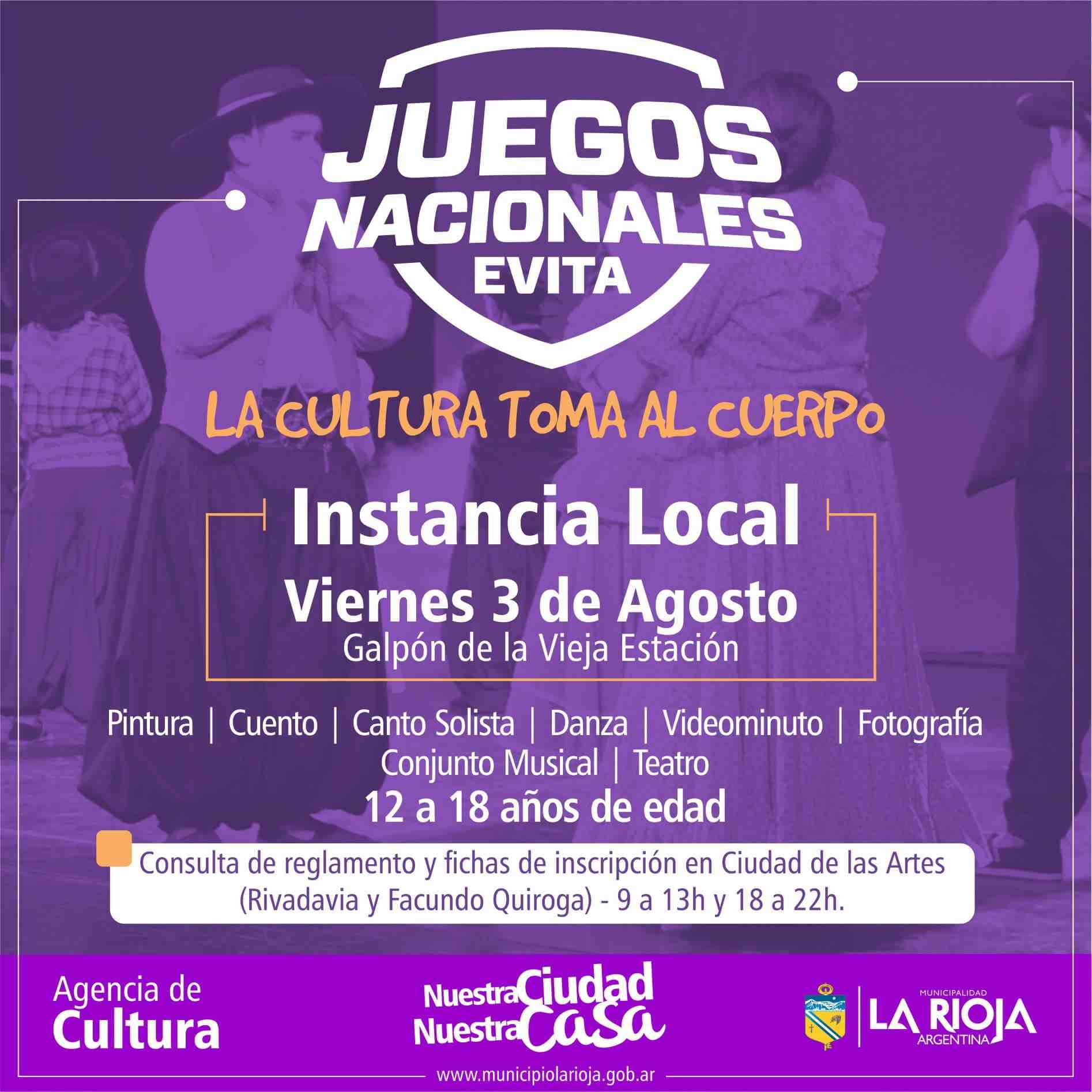 La Municipalidad de la Rioja, a través de la Agencia de Cultura, invita a participar de los juegos Nacionales Evita, a donde el próximo viernes 3 de agosto, se realizará la preselección en el Galpón de la Vieja Estación, a partir de las 10 horas..
