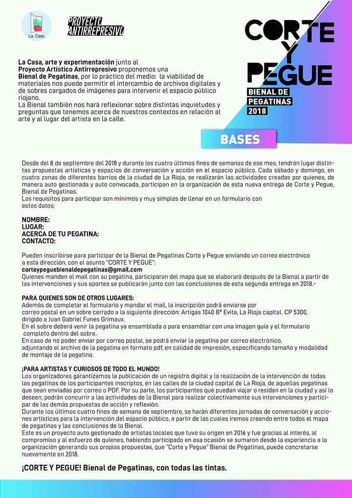 La Casa, arte y experimentación y Proyecto Artístico Anti Represivo, invitan a participar de la segunda Corte y Pegue Bienal de Pegatinas, a realizarse en la ciudad capital de La Rioja, los días 8 y 9, 15 y 16, 22 y 23, 28 y 29 de septiembre de 2018, en los barrios Islas Malvinas, Difunta Correa, Urbano 36 y Evita..