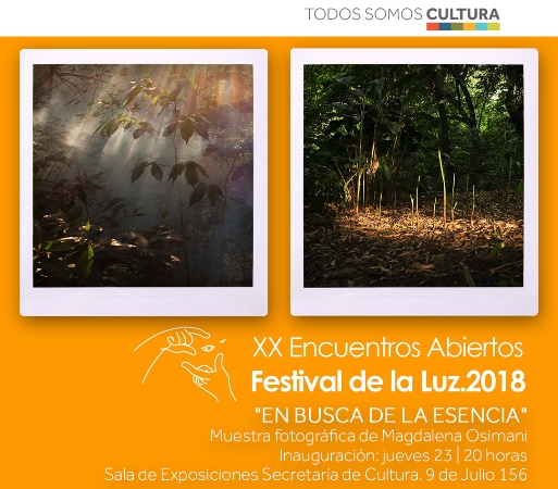 En el marco de los Encuentros Abiertos- Festival de la Luz 30 aniversario en la escena de la fotografía internacional, se inaugurará la muestra fotográfica "En busca de la esencia" de Magdalena Osimani (Tucumán) este jueves 23 de agosto a las 20 horas en la Sala de Exposiciones de la Secretaría de Cultura, en 9 de Julio 156..