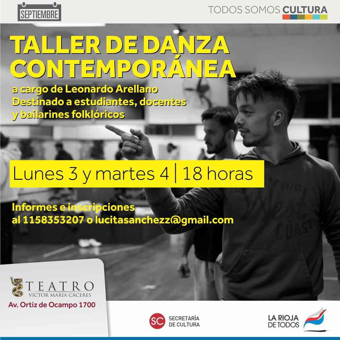 El lunes 3 y martes 4 de setiembre se desarrollará un Taller de Danza Contemporánea desde las 18 horas y a cargo de Leonardo Arellano en el Teatro Víctor María Cáceres..