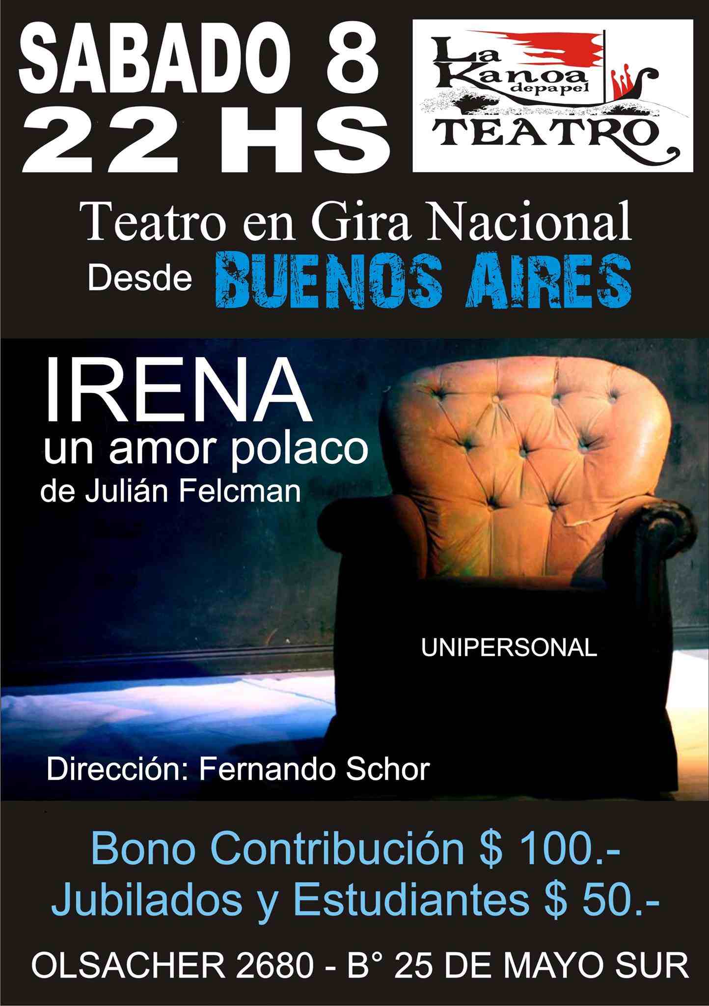 El sábado 8 de setiembre desde las 22 horas, la sala La Kanoa de Papel presenta la propuesta teatral "Irena, un amor polaco" de Julian Felcman con dirección de Fernando Schor, teatro en gira nacional desde Buenos Aires..