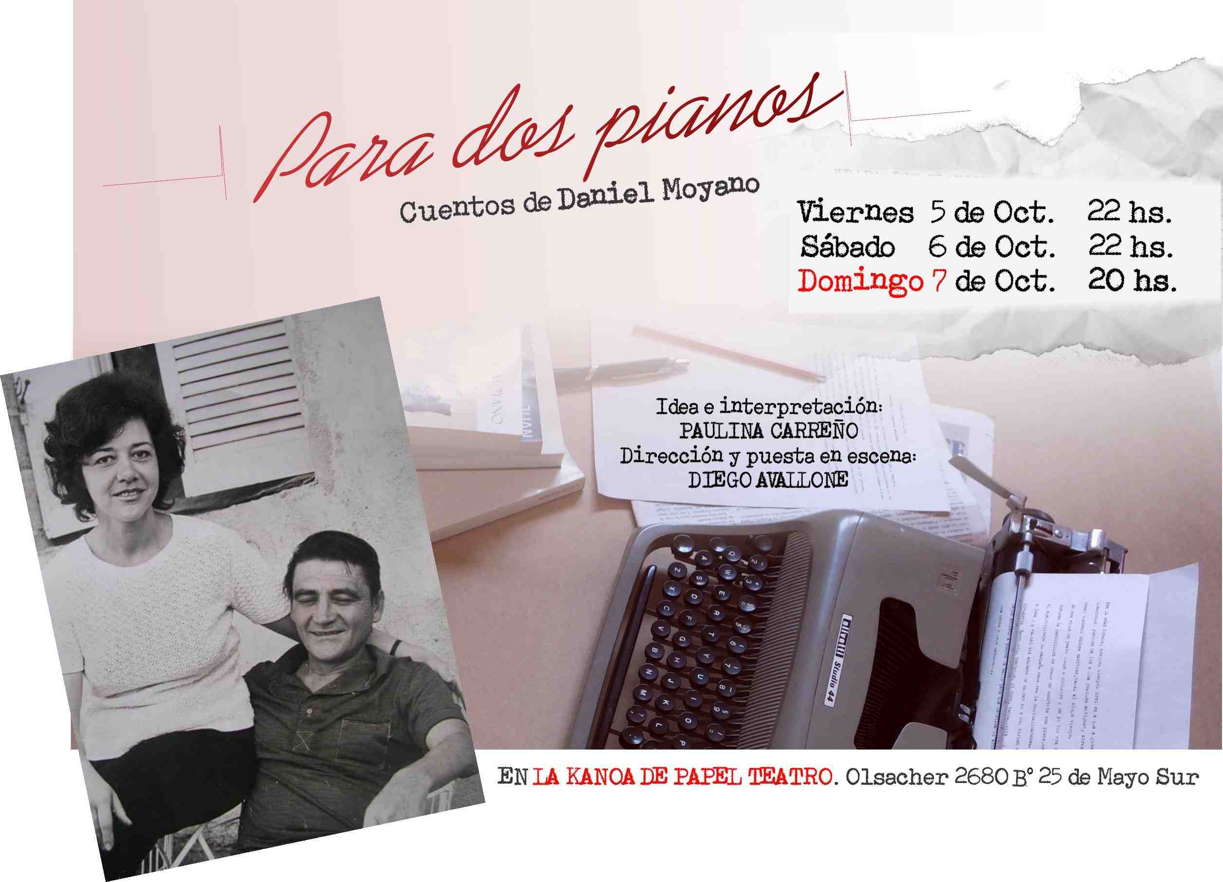 Luego de presentar en 2012 “Unos duraznos blancos y muy dulces”, sobre cuentos del mismo autor, Paulina Carreño vuelve ofreciendo al espectador “Para dos pianos”, donde la historia de amor de Daniel con quien fue su compañera de vida, es el pretexto para compartir nuevamente la exquisitez de su literatura. Desde la narración oral teatral, Paulina cuenta las historias desprendidas de los libros del escritor que vivió sus últimos años en el exilio.