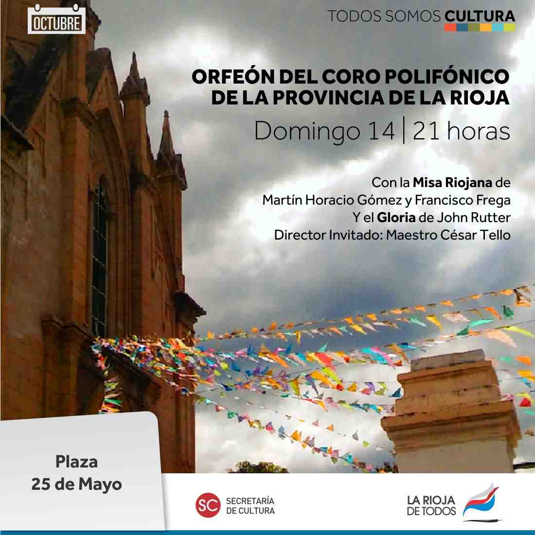 Este domingo 14 a las 21 horas, se presentará en Plaza 25 de Mayo el Orfeón del Coro Polifónico de la Provincia, elenco dependiente de la Secretaría de Cultura. Por cuarto año consecutivo, se renovará con la presentación de la Misa Riojana de Francisco Frega y Martín Gómez y el Gloria de John Rutter..