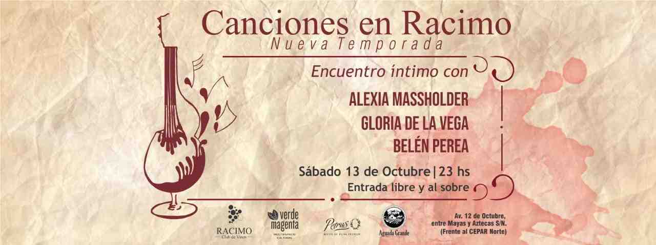 Alexia Massholder, Gloria de la Vega y Belen Perea presentan este sábado desde las 23 horas el espectáculo Ellas se Juntan en Racimo Club de Vinos en el marco del ciclo Canciones en Racimo (Av. 12 de Octubre 302)..
