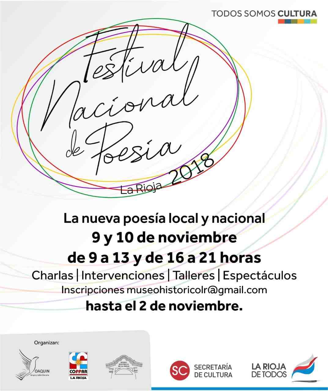Entre el 9 y el 10 de noviembre tendrá lugar el Primer Festival de Poesía "La nueva poesía local y nacional" en las instalaciones del Museo Histórico de la Provincia en los horarios de 9 a 13 y de 16 a 21..