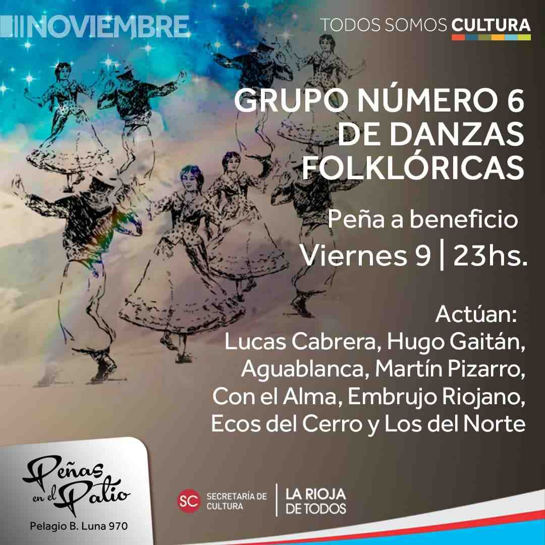 Este viernes 9 de noviembre a partir de las 23 horas, se realizará una peña a beneficio del Grupo Número 6 de Danzas Folklóricas Argentinas a cargo del profesor Nahuel Leguizamón. Lo recaudado durante la noche será destinado a la confección de los trajes que los bailarines usarán en la velada de fin de año en el Teatro Víctor María Cáceres. Los artistas que actuarán en este evento solidario son Lucas Cabrera, Hugo Gaitán, Aguablanca, Martín Pizarro, Con el Alma, Embrujo Riojano, Ecos del Cerro y Los del Norte