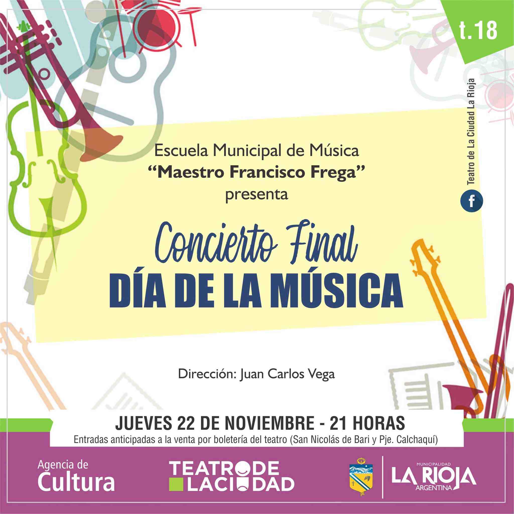 La Escuela Municipal de Música Maestro Francisco Frega presenta su concierto final en el marco del Día de la Música, con dirección de Juan Carlos Vega. Será el jueves 22 de noviembre desde las 21 horas en el Teatro de la Ciudad..