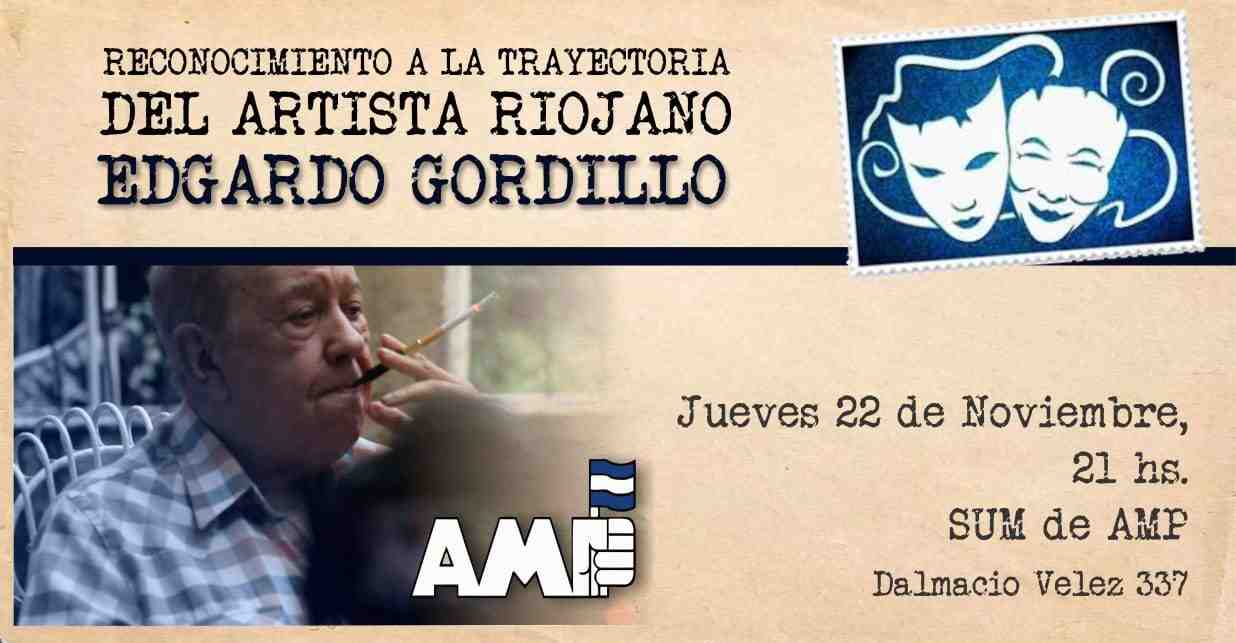 La Asociación de Maestros y Profesores de La Rioja, hará un reconocimiento a la trayectoria del artista riojano Edgardo Gordillo, un nombre fundamental de la Cultura y el Arte de la provincia y el país. Se exhibirá un video entrevista junto a la presentación de una escena de Bodas de Sangre, de Federico García Lorca. Será el jueves 22 de noviembre, a las 21, en el Sum del gremio, en Dalmacio Velez 337. Se invita a toda la comunidad..
