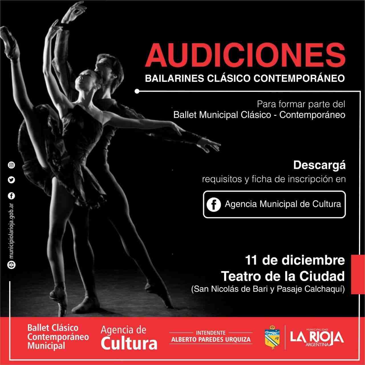 La Agencia Municipal de Cultura convoca a una audición para selección de bailarín/a para integrar 1 (uno) cargo disponible en el Ballet Clásico-Contemporáneo Municipal. Se realizará en base a una evaluación de aptitud física y competencia el martes 11 de diciembre a las 8:30 horas en el Teatro de la Ciudad..
