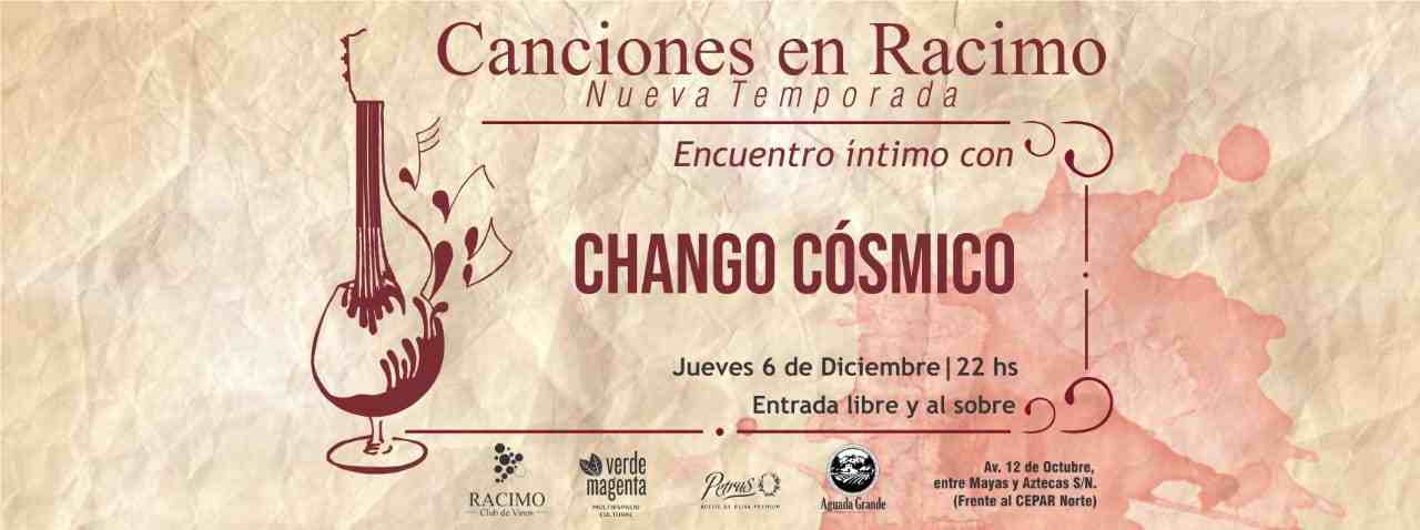 El jueves 6 de diciembre desde las 22 horas, Racimo - Tienda de vinos invita al evento Chango Cósmico en el marco del ciclo Canciones en Racimo. La entrada es libre y al sobre..